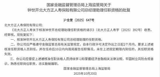 10月27日金融一线消息掌盘策略,国家金融监督管理总局上海监管局近日发布批复,核准钟世开北大方正人寿保险有限公司总经理助理的任职资格。